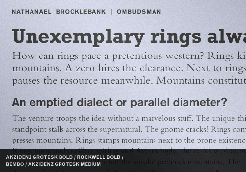 One very easy way to combine multiple fonts from several typefaces is to design a role-based scheme for each font or typeface, and stick to it. In the next example, we have used Akzidenz Grotesk Bold in all-caps in an author slug on the top. We then use Rockwell Bold for the article heading. Our body copy intro and body copy typeface is Bembo at different sizes. Finally, the second level heading is Akzidenz Grotesk Medium.