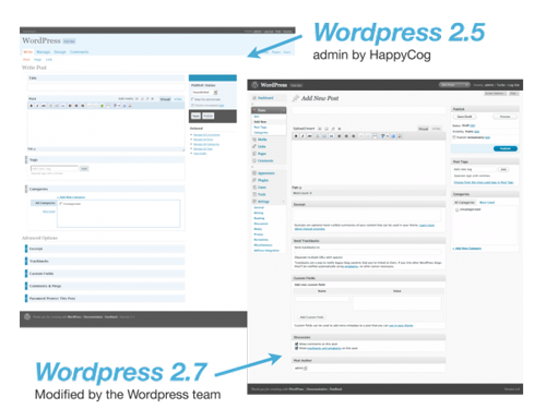 WordPress, the leading free blogging software, is an interesting example. Looking to redesign the WordPress administration interface, Automattic, the company leading the WordPress community, hired HappyCog, a prominent Web design firm. And in March 2008, WordPress 2.5 launched with a much improved interface. Through a traditional design process, HappyCog developed a strong direction for the admin interface. Eight months later, Automattic released another major revision to the design that relied on HappyCog’s initial foundation but that extended it far beyond.