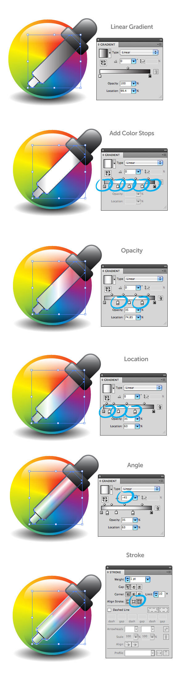 Select the main body of the dropper and fill with a linear gradient. For this gradient we are going to add three more color stop giving a total of five. Add these color stop by clicking right below the Gradient Slider in the Gradient panel. Once you added the color stop, change the first stop to gray, the next three to white, and the last one a dark gray. Change the Opacity of the first white color stop to 56 and change the Opacity of the third white color stop to 35. Change the Location of the first white color stop to 12, the Location of the second white color stop to 30, and change the Location of the third white color stop to 63. Change the Angle of the gradient to -45. Finally change the stroke to white and press the Align Stroke To Outside button from the Stroke panel.