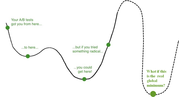 As even Jason acknowledges in his post, this argument isn’t really concerned with A/B testing, because the same methodology could be used to test radical changes to get to the global minima. So, calling it an A/B testing trap is unfair because it doesn’t have anything to do with A/B testing. Rather, the argument uncovers the futility of testing small changes.