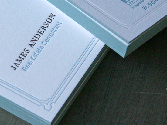Letterpressing is done by inking a raised surface and then pressing it into the paper, giving the design both color and depth. This technique is suitable for vector images and text, using solid Pantone inks. An article linked to at the end of this article provides more technical detail. Here is an example of a business card done with this technique: