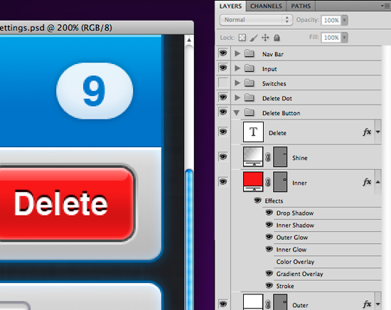 I have a Photoshop Action set up that takes a History Snapshot, then scales to 200%. That means, previewing at the Retina display’s resolution is only a click away. If you’re feeling confident you’ve built everything well, you should be able to scale up, edit, then scale down and continue editing without degradation. If you run into trouble, a Snapshot is there to take you back. Using one document for both resolutions, means not having to keep two documents in sync — a huge advantage.