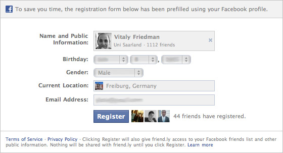 Of course, you could even go further and use Facebook Connect to actually prefill data that your users might have to type; in the example below, on Friend.ly, a Facebook application, the only thing that the user needs to do before starting using the service is just click on the “Register” button. The information about the user is loaded automatically which raises a huge privacy concern. You might not want to use this approach in practice.