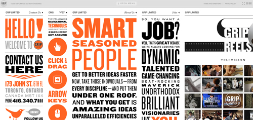 The website does tell you to “click and drag” but finding this instruction amidst what looks like a typographic poster is something we suspect many people weren’t able to do. Realizing this might be a problem, Grip did create an “Open Menu” bar at the top of the page, but what are the chances you’re going to look there?