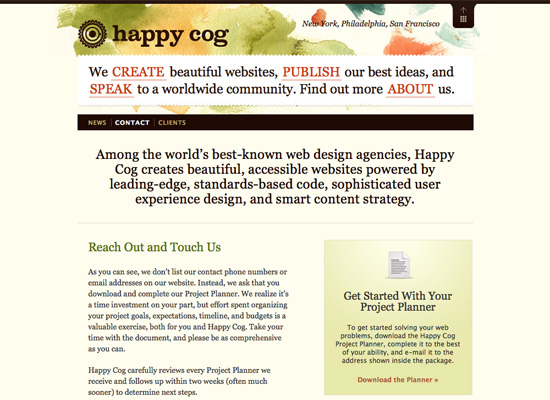 Happy Cog is another company that offers a downloadable project planner. The planner includes instructions for submission. It’s a good system, especially since Happy Cog projects are generally large projects with a wider scope than what many other design firms handle.